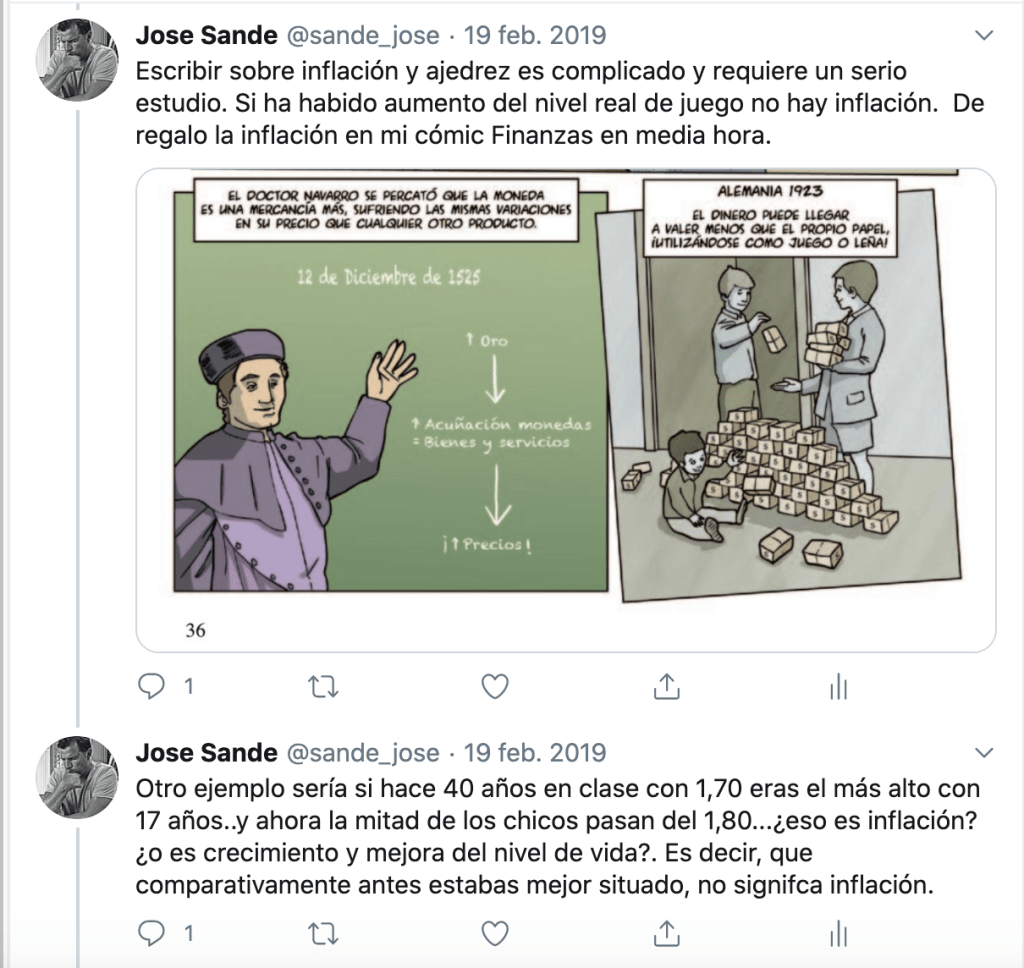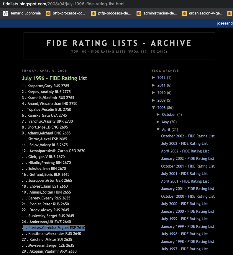 La misma barra (fuerza de juego), tiene un precio nominal muy superior (ELO). Y eso no pasa en ajedrez…si no todo lo contrario…realmente hasta me atrevería a decir que ¡existe deflación! La fuerza de juego de Antón o Vallejo actual, es superior a la de un 2700 del año 1996. Con esto no quiero decir que tengan más mérito que el Kamsky o el Ivanchuk del año 1996, ya que evidentemente ellos dadas las circunstancias vigentes en ese momento, llegaron más alto en la clasificación de ese momento y si estuvieran en su época de juventud en el momento actual, estarían de nuevo entre los mejores jugadores del mundo debido a su gran talento.