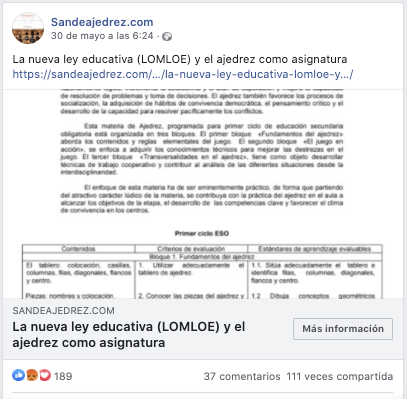 Y esto no es tan complicado…como ejemplo, promocioné un par de días con muy pocos euros una publicación en facebook sobre la nueva ley educativa y el ajedrez, y se empezó a compartir y compartir…hasta 111 veces…llegando a 33.000 personas interesadas en el ajedrez en España…si esto lo puede hacer en 4 días un aficionado con 5 euros…