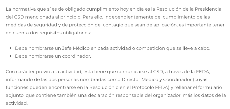 Por último, el protocolo COVID de la FEDA está pensado para grandes eventos que pueden permitirse nombrar un juez médico para cada competición…no para el 99,99% de la actividad federada en España…