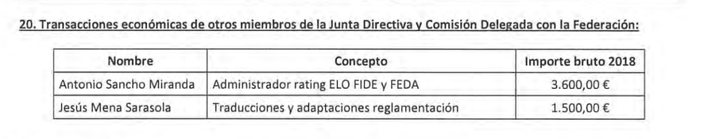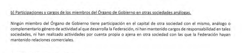 Pues bien… en la página 63 de las últimas cuentas anuales de 2018, la FEDA dice que ningún miembro ni de la Asamblea, ni de la Comisión Delegada, ni de la Junta Directiva… ha tenido ningún cargo de responsabilidad en ninguna empresa que haya facturado un euro a la FEDA.