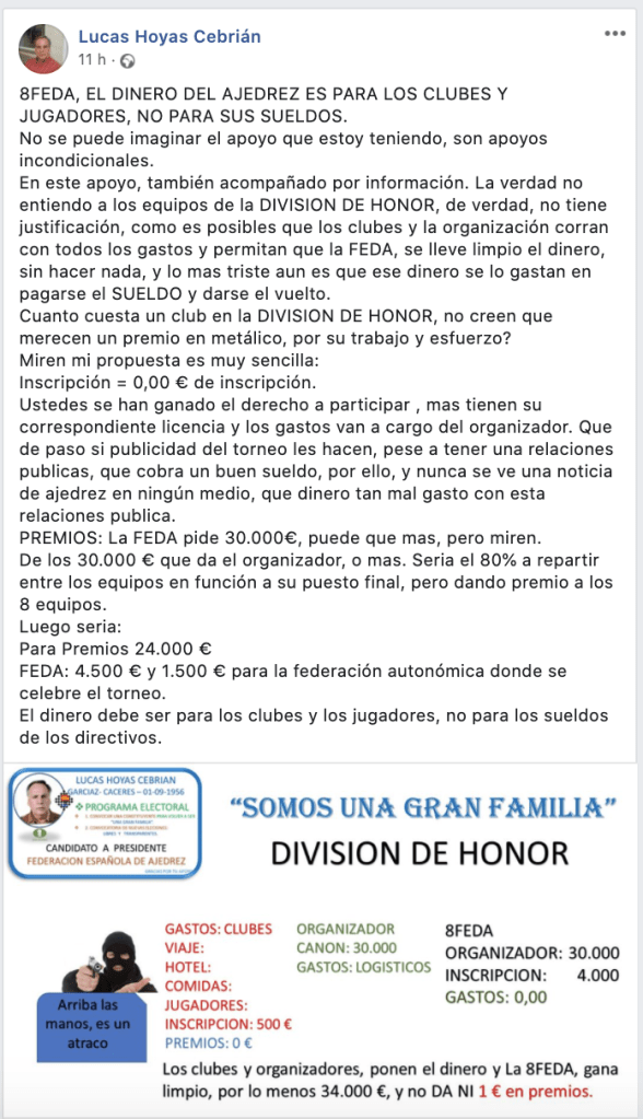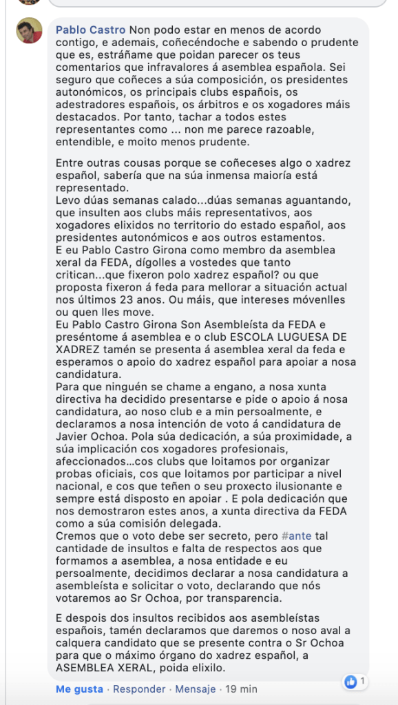 El Gran Maestro Español Juan Manuel Bellón (del que no me consta que ni tenga interés en presentarse ni esté manipulado por nadie como apunta Pablo Castro) , también ha presentado propuestas constructivas para mejorar la FEDA en su muro de facebook: