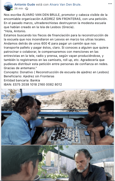Antonio Gude publica en su facebook que hacen falta 600 euros para reconstruir la escuela de ajedrez para refugiados de Lesbos.