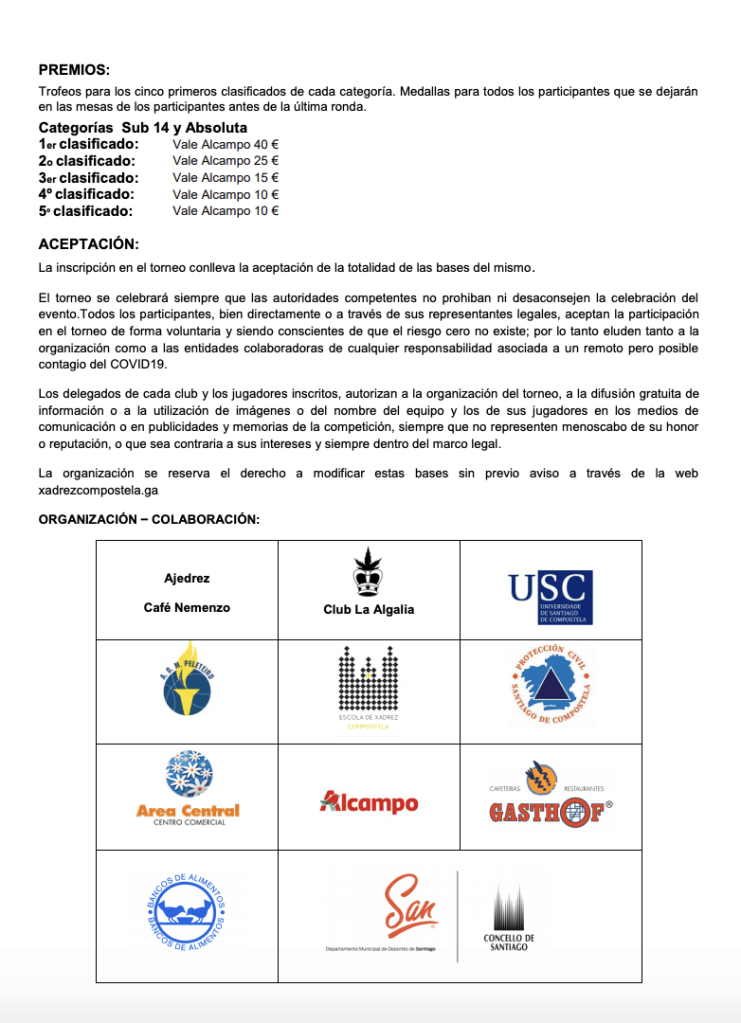 Nuevas Bases Torneo solidario 4 septiembre en Santiago (suspendido) 16 julio, 202020 agosto, 2020 Jose Sande Diego Espiñeira me envía las nuevas bases del torneo: Descargar bases Compártelo: Haz clic para compartir en X (Se abre en una ventana nueva) X Haz clic para compartir en Facebook (Se abre en una ventana nueva) Facebook Me gusta Cargando... Relacionado Publicado por Jose Sande Jose Sande Soy profesor de Economía en IES y de Economía de la Empresa en la Universidad Oberta de Cataluña (www.uoc.edu). Docente, preparador de opositores, autor, editor, ajedrecista y sabinero. Ver todas las entradas de Jose Sande Compártelo: Haz clic para compartir en X (Se abre en una ventana nueva) X Haz clic para compartir en Facebook (Se abre en una ventana nueva) Facebook Me gusta Cargando...