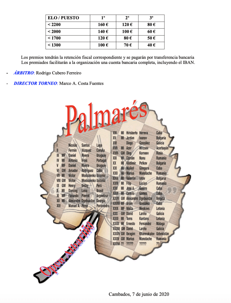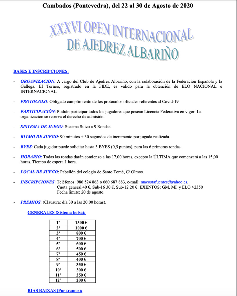 XXXVI Open Albariño en Cambados 22-30 agosto (aplazado) 28 julio, 202020 agosto, 2020 Jose Sande Rodrigo Cubero, árbitro del torneo, me envía las bases: Compártelo: Haz clic para compartir en X (Se abre en una ventana nueva) X Haz clic para compartir en Facebook (Se abre en una ventana nueva) Facebook Me gusta Cargando... Relacionado Publicado por Jose Sande Jose Sande Soy profesor de Economía en IES y de Economía de la Empresa en la Universidad Oberta de Cataluña (www.uoc.edu). Docente, preparador de opositores, autor, editor, ajedrecista y sabinero. Ver todas las entradas de Jose Sande Compártelo: Haz clic para compartir en X (Se abre en una ventana nueva) X Haz clic para compartir en Facebook (Se abre en una ventana nueva) Facebook Me gusta Cargando...