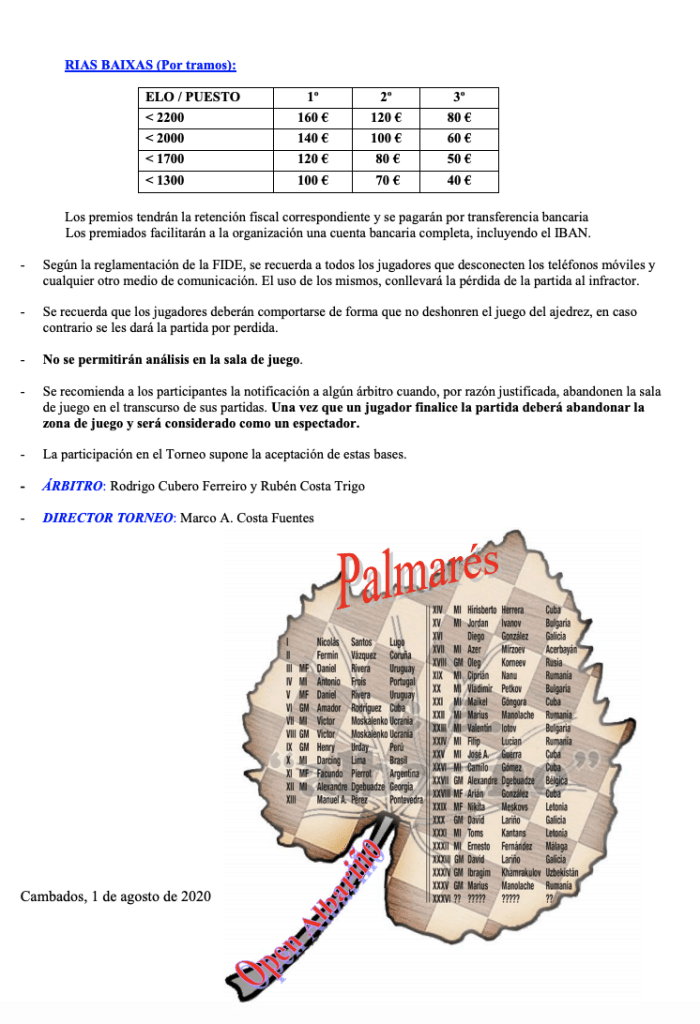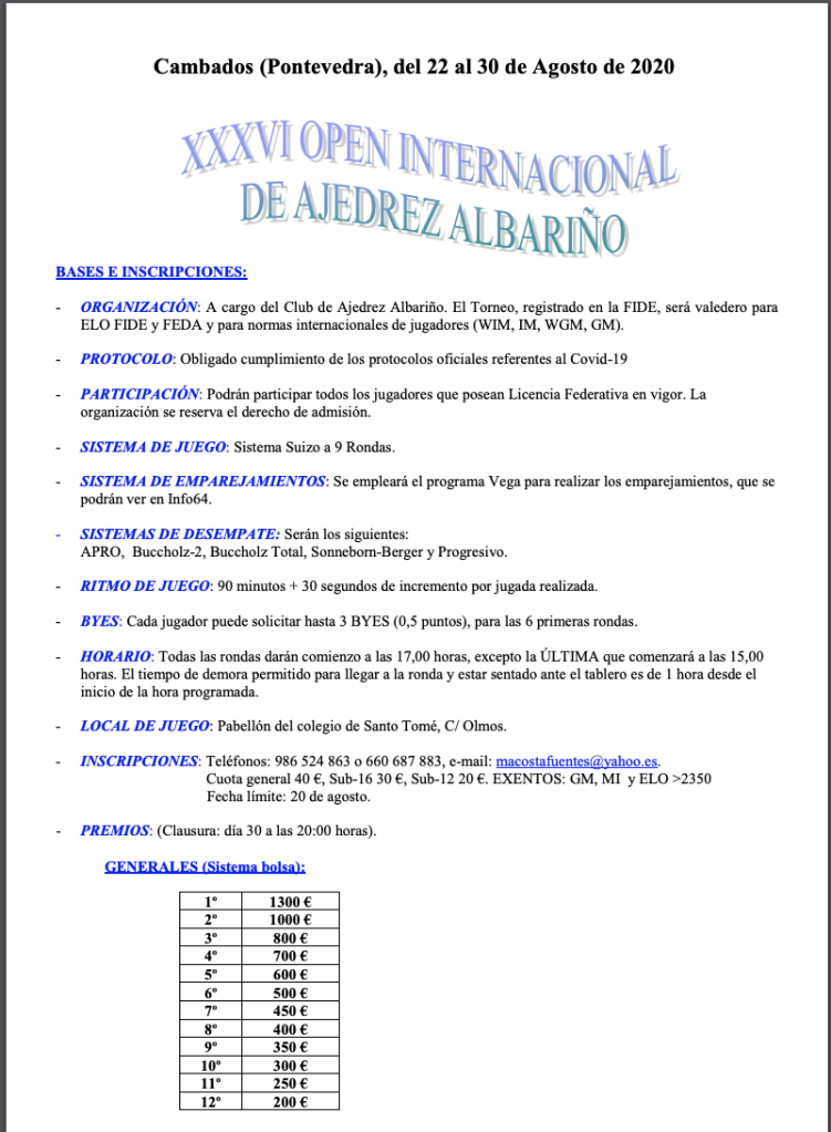 Nuevas bases XXXVI Open Albariño en Cambados 22-30 agosto (aplazado) 4 agosto, 202020 agosto, 2020 Jose Sande Rodrigo Cubero, el árbitro del evento, me envía las bases definitivas. Compártelo: Haz clic para compartir en X (Se abre en una ventana nueva) X Haz clic para compartir en Facebook (Se abre en una ventana nueva) Facebook Me gusta Cargando... Relacionado Publicado por Jose Sande Jose Sande Soy profesor de Economía en IES y de Economía de la Empresa en la Universidad Oberta de Cataluña (www.uoc.edu). Docente, preparador de opositores, autor, editor, ajedrecista y sabinero. Ver todas las entradas de Jose Sande Compártelo: Haz clic para compartir en X (Se abre en una ventana nueva) X Haz clic para compartir en Facebook (Se abre en una ventana nueva) Facebook Me gusta Cargando...