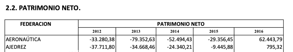 Es decir, los directivos profesionales de la FEDA ya no es que aumentarán el patrimonio neto de la misma, ya no es que la empobrecieran (su patrimonio neto fuera menor…) es que la quebraron contablemente estando 4 años con patrimonio neto negativo y teniéndola que rescatar el CSD. Los años siguientes podemos decir que seguía en la UCI debatiéndose entre la vida y la muerte, y gracias al Mundial de edades de Santiago 2018, ahora ya ha salido de la UCI pero con unas graves dificultades respiratorias y un cuadro clínico muy complicado.