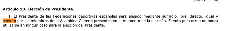 Y entre otros problemas, tenemos que la Orden ECD 2764/2015 de 18 de diciembre que rige las elecciones de las federaciones deportivos dice que el voto para elegir Presiente ha de ser secreto y nunca por correo.