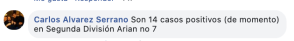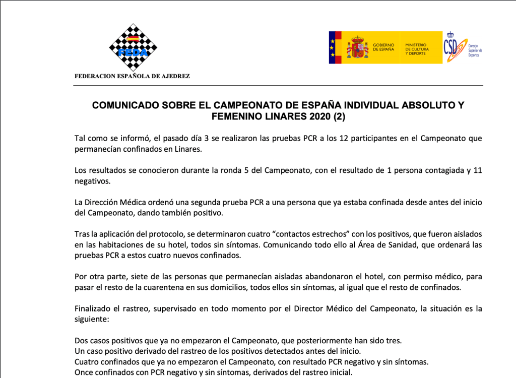 En respuesta a la reflexión del Gran Maestro y abogado Arian González, un jugador públicamente en facebook, manifiesta que en su equipo ha habido 4 contagios, y que el total de contagios del campeonato de segunda división son al menos 14.