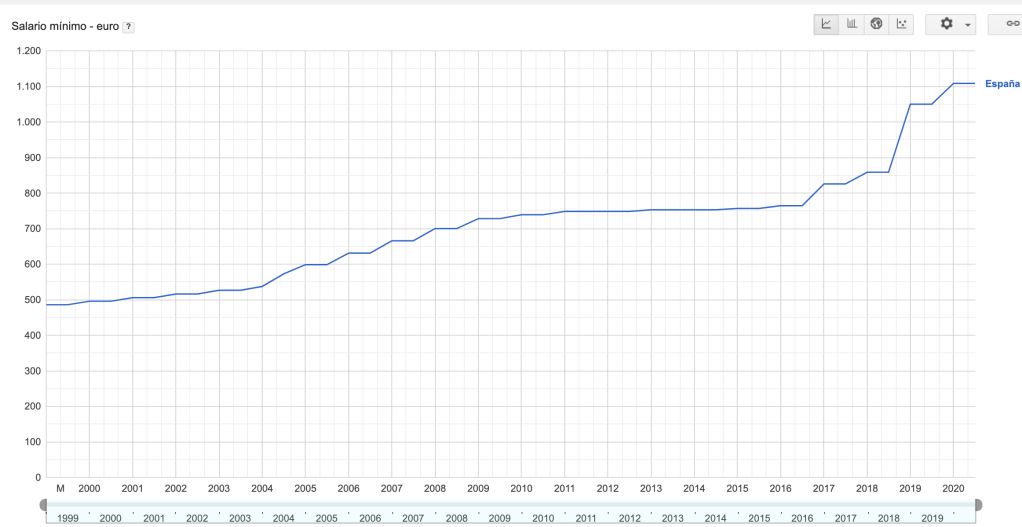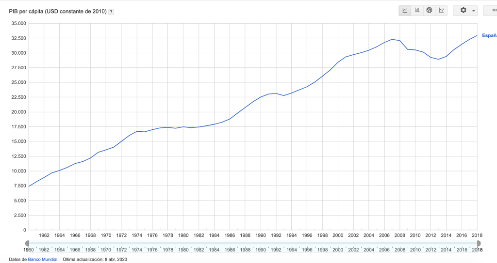 Vemos en la siguiente gráfica que a pesar de la inflación, y de la crisis de 2007, el PIB por persona en España aumentó en los últimos 23 años.