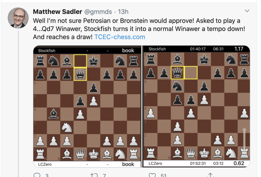 Recomiendo seguir por twitter al GM Matthew Sadler, autor del libro «Game Changer» que a diario comenta los enfrentamientos entre módulos y el cambio en la concepción del juego que están creando.