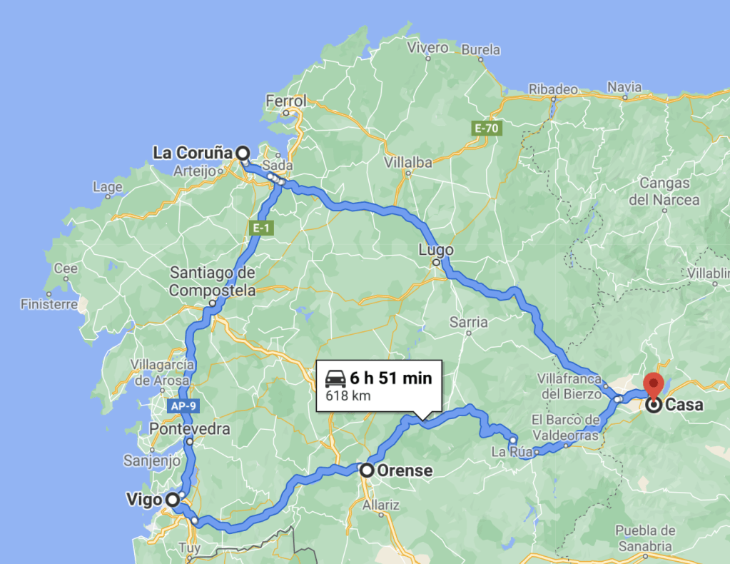 Este fin de semana, por motivos justificados y acreditados documentalmente que no vienen al caso, tuve que hacer la siguiente ruta en coche: Ponferrada, Lugo, Coruña, Vigo, Ourense, Ponferrada…¡Las cuatro provincias gallegas!