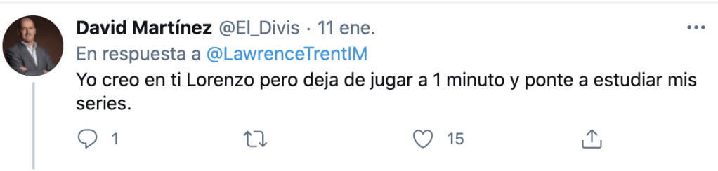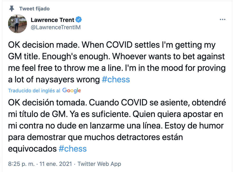Es MI y le falta una norma y 100 puntos para ser GM. Al arrancar este año decidió esforzarse en llegar a GM y así lo comunicó en twitter. Se da de margen 2 años, y se dedicará casi exclusivamente a ello.