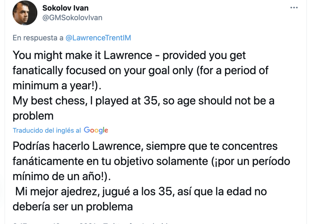 El problema suele ser mantener esa ilusión cuando los resultados no te acompañan porque tu energía y resistencia disminuye. Recuerdo hace unos años que Seirawan con 50 años comentaba que entrenando y jugando veía factible llegar a 2700…