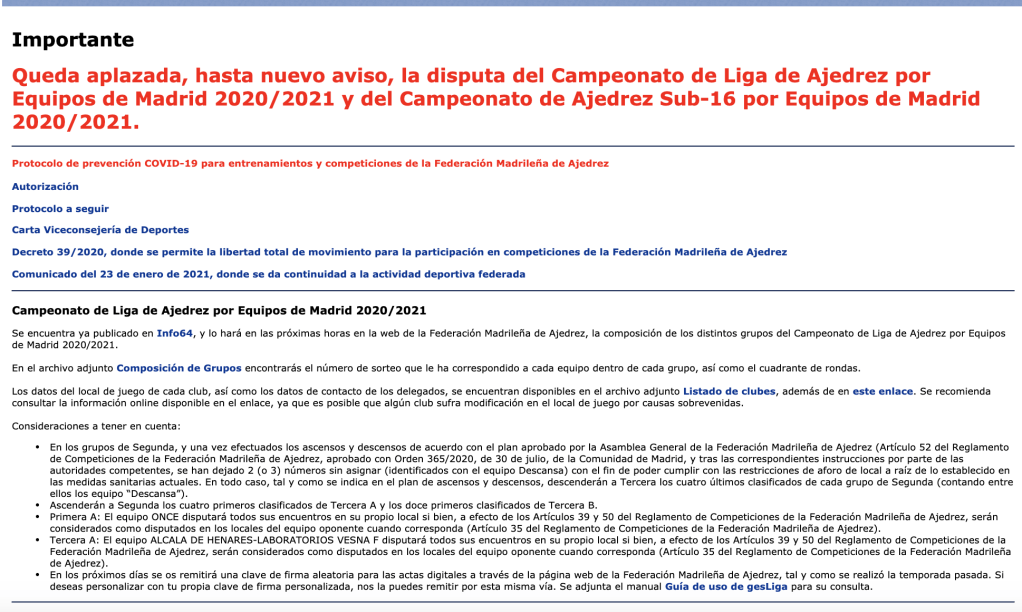 En Madrid se ha jugado una ronda de la liga por equipos y se ha suspendido por la situación COVID.
