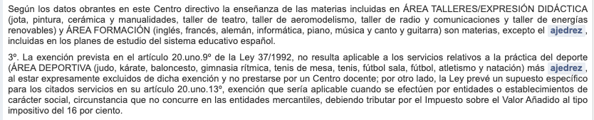 De nuevo vuelve a decir que si es materia en plan de estudios está exenta…pero si actividad deportiva…y el ajedrez es deporte…si no es una entidad social, hay que facturar el 21% de IVA.