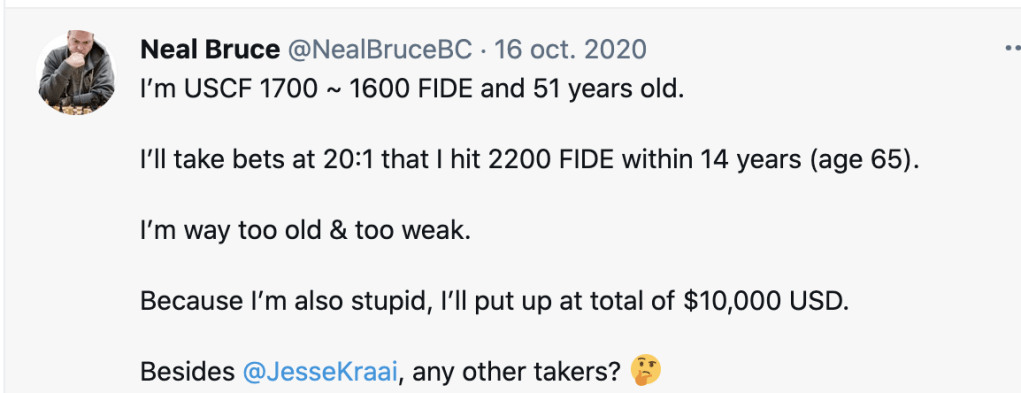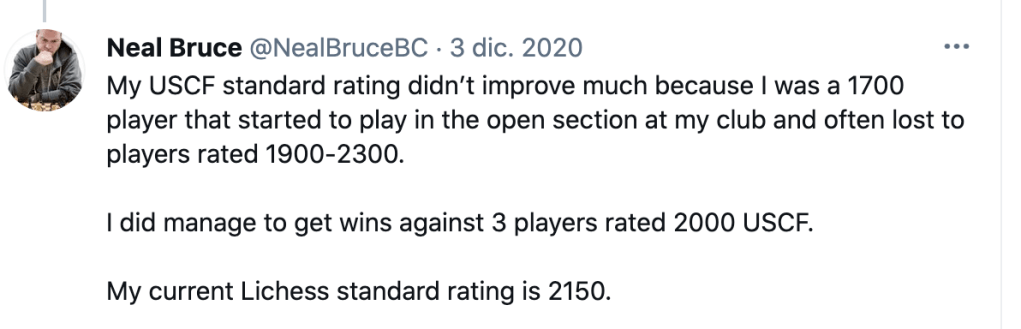 1. Al hilo del post actual y del anterior creo que que cualquiera sin problemas de salud asociados que tenga un nivel de 1200 o más trabajando duro puede llegar a los 2100-2200 a base de hacer táctica (en 2-4 añitos o en función del tiempo de trabajo) fácilmente.