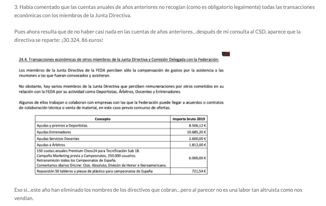 Ya comenté en varias ocasiones que es indispensable separar los intereses personales de la labores directivas, y que en la FEDA había mucha mezcla extraña que no se reflejaba en las cuentas anuales. Y después de mis consultas al CSD de repente en las últimas cuentas aparecieron más de 30.000 euros que se repartían miembros de la Junta Directiva haciendo trabajos para la Federación.