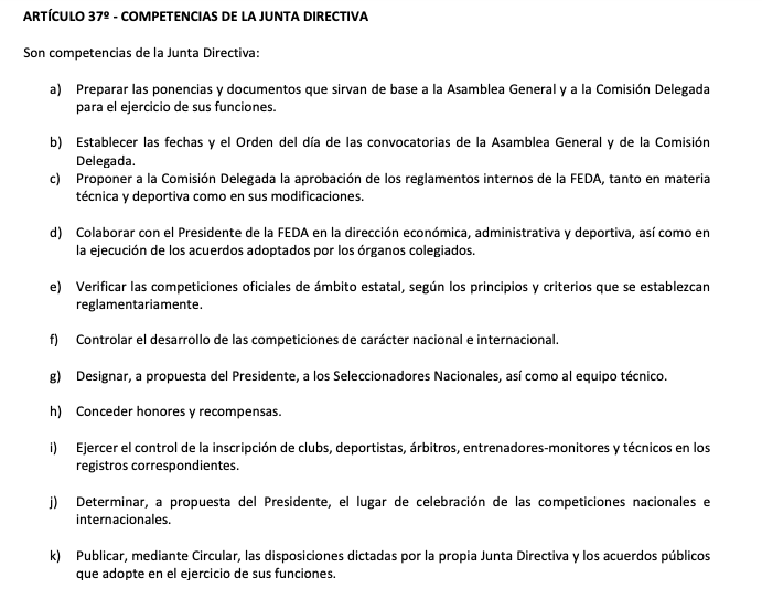 Sigue el asunto muy feo, el problema es que según los estatutos de la FEDA el Secretario no forma parte de la Junta Directiva. Otra cosa es que tenga que estar presente para elaborar las actas que firma el Presidente. En otras Federaciones no aparece el Secretario ni «apartado»…