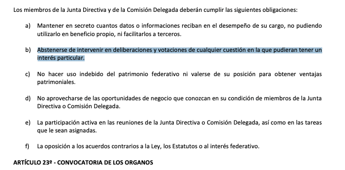 Los estatutos FEDA también dicen que lógicamente los miembros de la Junta directiva deben abstenerse en temas que les implica personalmente. Por lo que habrá que comprobar las actas para verificar las abstenciones en tantos casos particulares que se están dando que suman más de 30.000 euros al año…desde compra de material (oportunidad de negocio)…a ser designados entrenadores o árbitros.