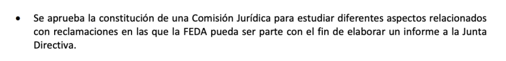 Comenté esta mañana que por fin la FEDA ha decido publicar los acuerdos de su Junta Directiva. Sobre los años anteriores ya serán los tribunales los que juzguen la importancia de esta grave omisión y sus consecuencias penales. De hecho uno de los acuerdos de Junta Directiva es crear una Comisión jurídica para empezar a tomarse en serio todas las chapuzas que llevan años haciendo.
