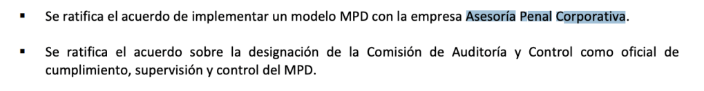 Otro de los acuerdos es contratar a un despacho especializado en Delitos (Asesoría Penal Corporativa) para que implante un MPD (Modelo de Prevención de Delitos), conocido como «CRIMINAL COMPLIANCE», es decir, intentar evitar que los directivos se conviertan en criminales.
