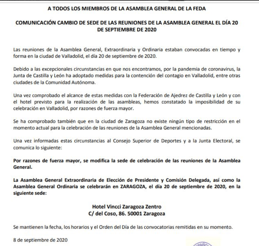 Sería de esperar que la FEDA realizara las asambleas en un lugar que garantizase que todos los asambleístas puedan acudir, además por supuesto de los miembros de la mesa y el candidato a Presidente, pero supongo que como suele pasar con la FEDA , ellos siempre disponen de información más precisa que explica todas las dudas razonables que nos surgen de su gestión.