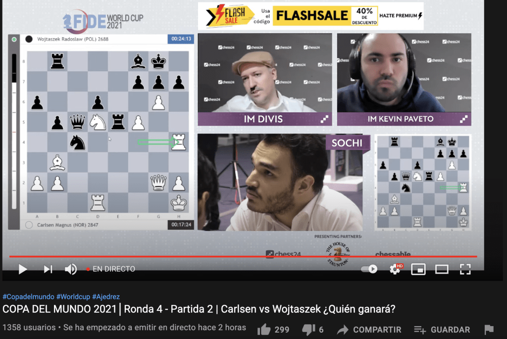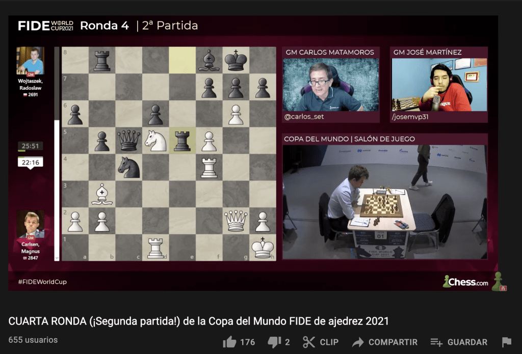 Lo sorprendente es el bajo número de seguidores de cada canal. Ahora mismo en Chess.com está sobre 650, en el de la FIDE 2.700 y en Chess24 1.400.