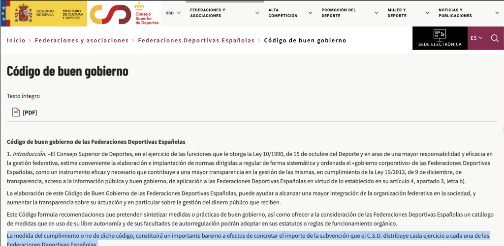 Al margen de las implicaciones legales de los procedimientos judiciales administrativos y penales, que ya veremos cómo acaban, pero el CSD ya ha valorado que hay indicios de infracciones graves, lo que supondría que se podría corroborar el supuesto delito de apropiación indebida (esta categorización la ha establecido un juez de lo penal), las subvenciones dependen del cumplimiento por parte de la FEDA del código de buen gobierno del CSD.
