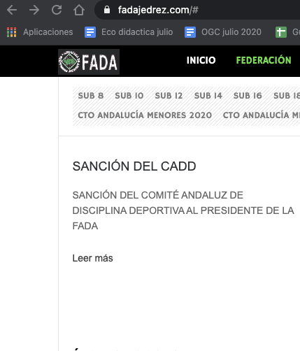 La Federación Andaluza de Ajedrez ha publicado en su web la sanción que ha sufrido su Presidente por vertir y publicar notoriamente afirmaciones no ciertas sobre un federado. Añade que es un desprestigio para el colectivo de ajedrecistas andaluces.