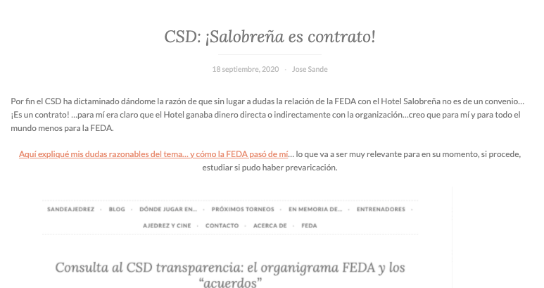 También expliqué mis dudas sobre el proceso electoral, que para la mayor parte de ajedrecistas que tienen una postura objetiva les parecieron al menos dudas razonables. Finalmente en febrero de 2021 (sí, el CSD es lento para todo…) el CSD condenó a un miembro de la Comisión Gestora de las elecciones FEDA por parcialidad (cuando lógicamente debe ser imparcial). Se está pendiente de que el TAD abra el expediente oportuno y se le sancione…pero la FEDA lo sigue manteniendo en su Junta Directiva cuando la normativa la obliga a tomar medidas cautelares.