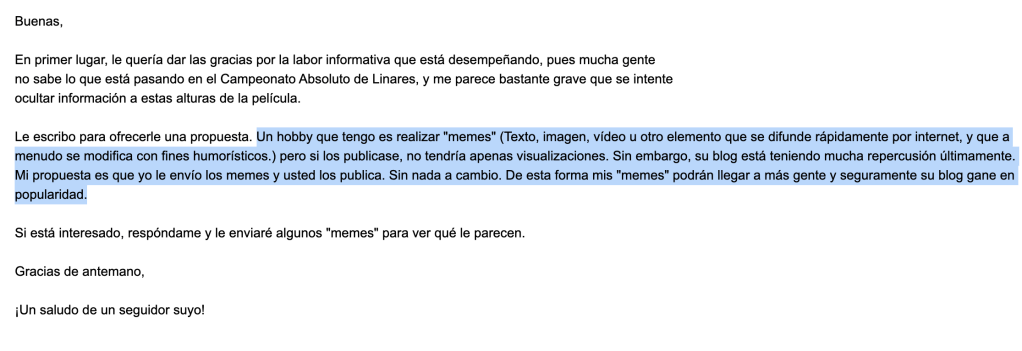 Como la FEDA me parece un asunto muy serio, por supuesto que me negué, entiendo que hay un derecho a la caricatura…pero no me parece adecuado dedicarnos a cosas tan infantiles con jueces de lo Penal investigando a la alta directiva FEDA por supuesta apropiación indebida….¿Y qué hace la directiva FEDA?… pues se dedican a hacer memes de Lucas Hoyas (mofándose de su antigua profesión de binguero).