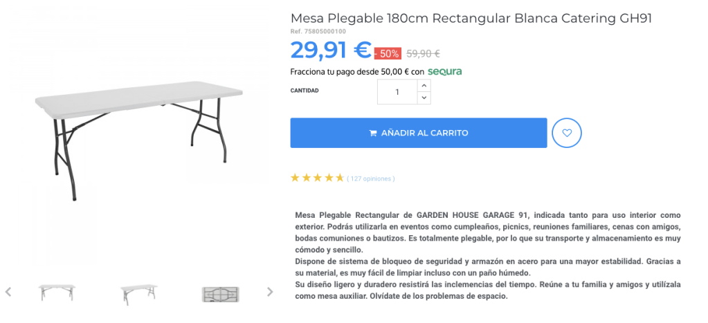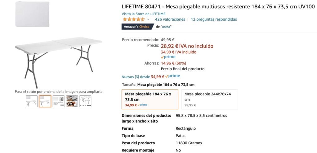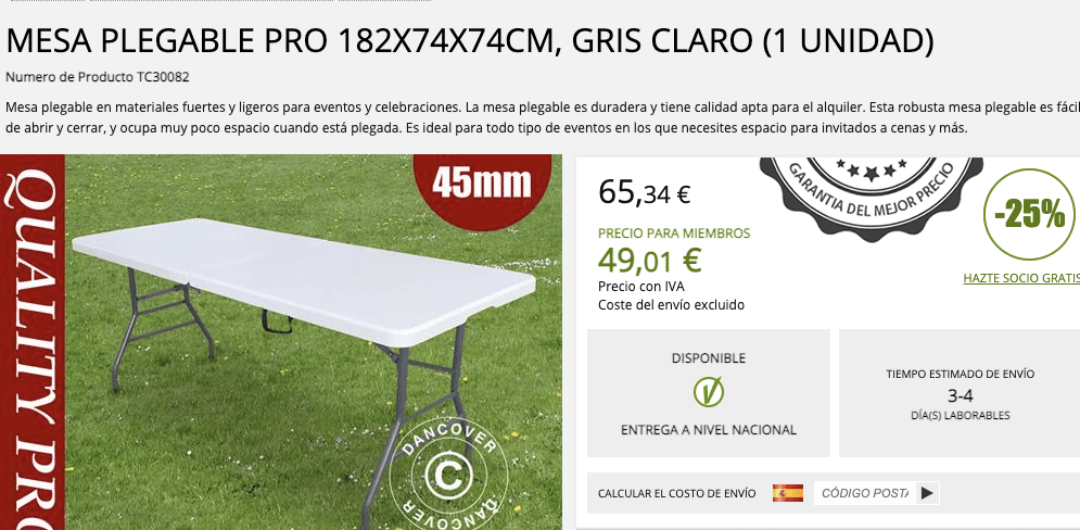 El precio es más del doble del primer modelo (65,34 euros), pero hacerse socio es gratis y sale por 49 euros. Soporta el doble de peso y tiene calidad para alquiler. Son las mesas que suelen alquilar las empresas de eventos (catering, etc..). Se puede comprar como las otras plegable y que dobla, o en una pieza.